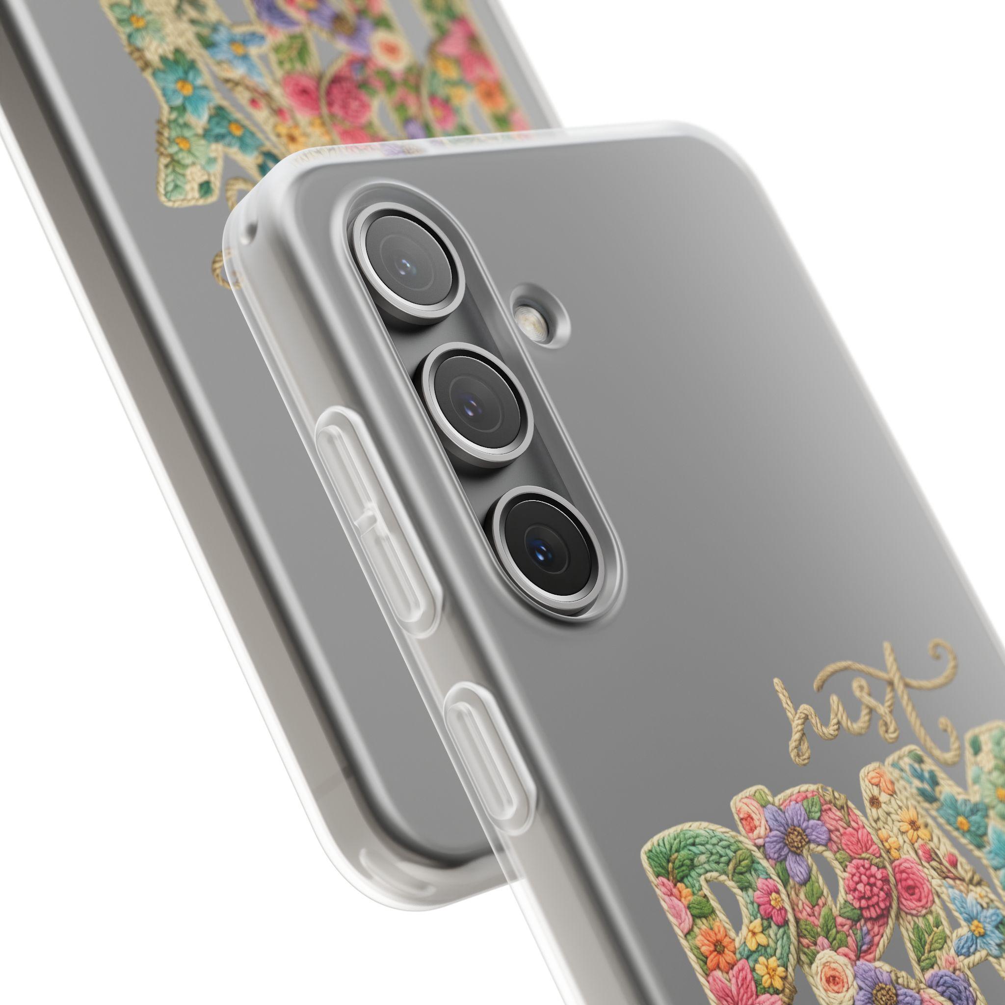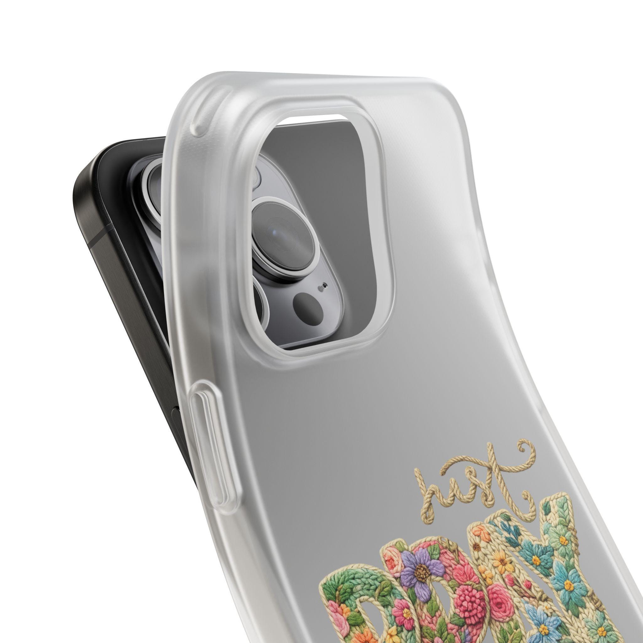 A slim, flexible phone case that brings a soft, floral energy to your everyday carry. Lightweight TPU wraps your device in a frosted, semi-transparent shell that absorbs shocks while staying thin and pocket-friendly. The colorful, textured lettering peeks through the matte finish, giving your phone a handcrafted, botanical look without bulk. Precise cutouts keep charging and wireless power effortless, and the impact-resistant build keeps edges and corners protected from drops and scrapes. Comes from responsibly certified manufacturing and can be packaged ready for gifting.