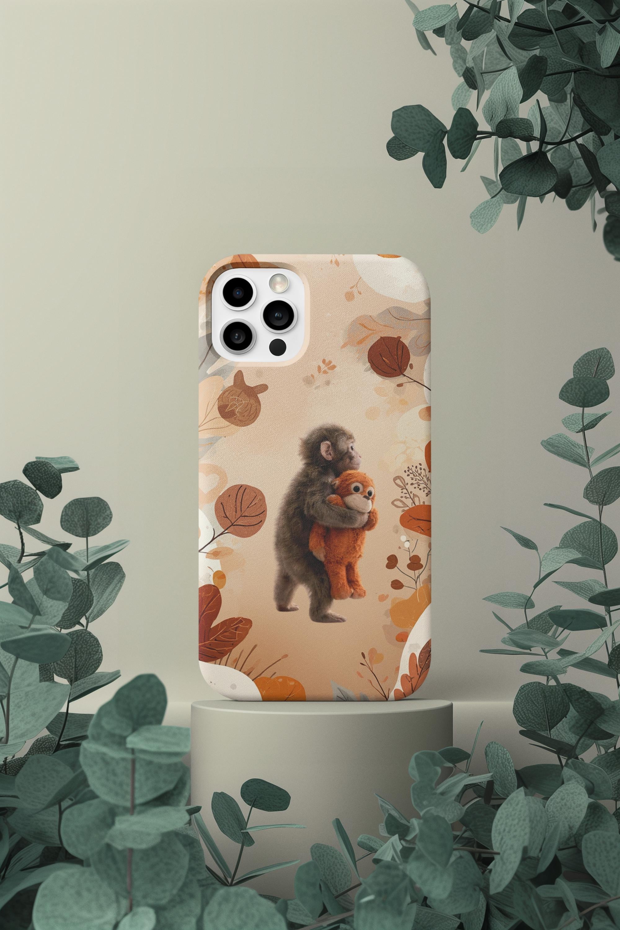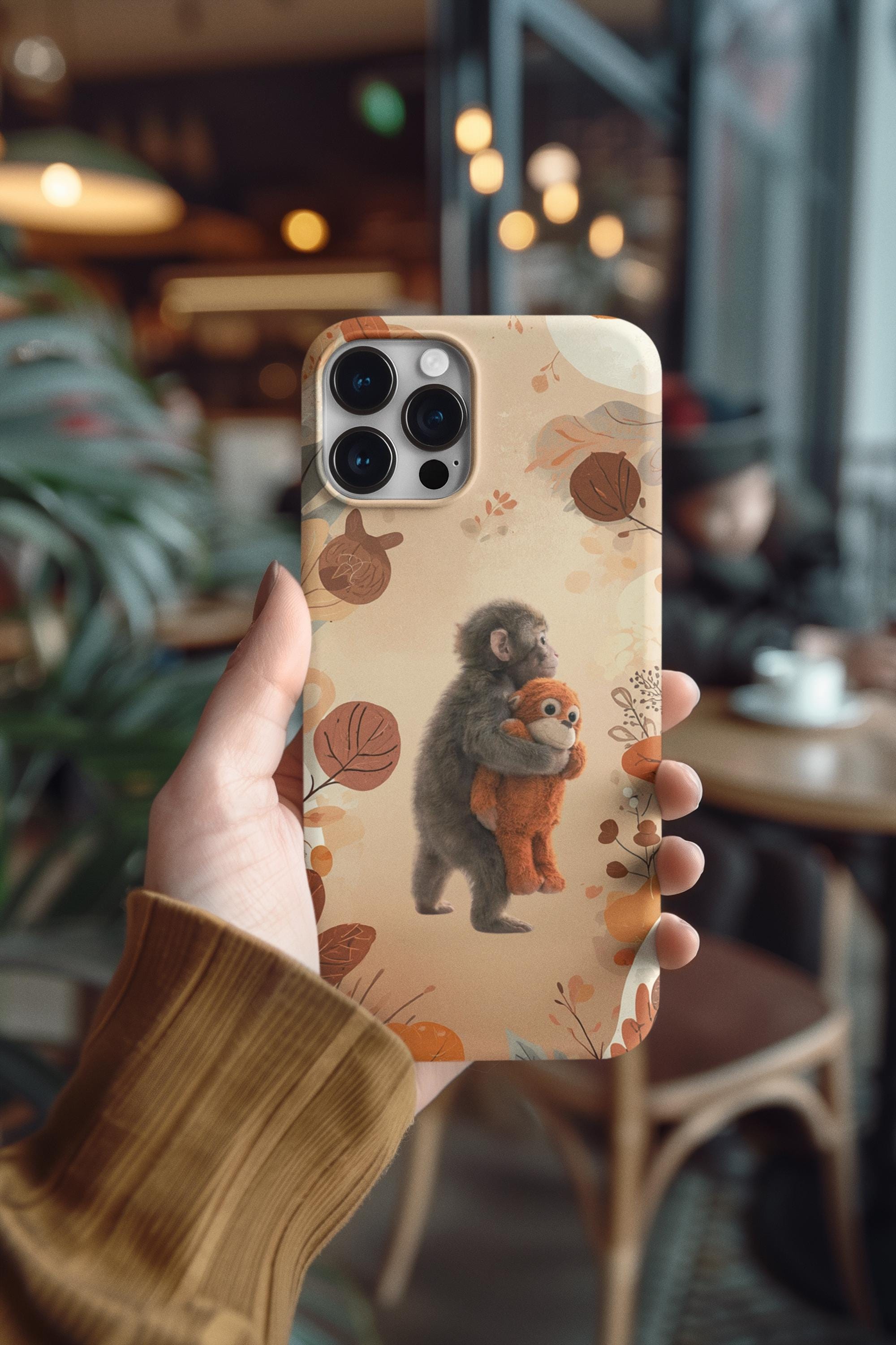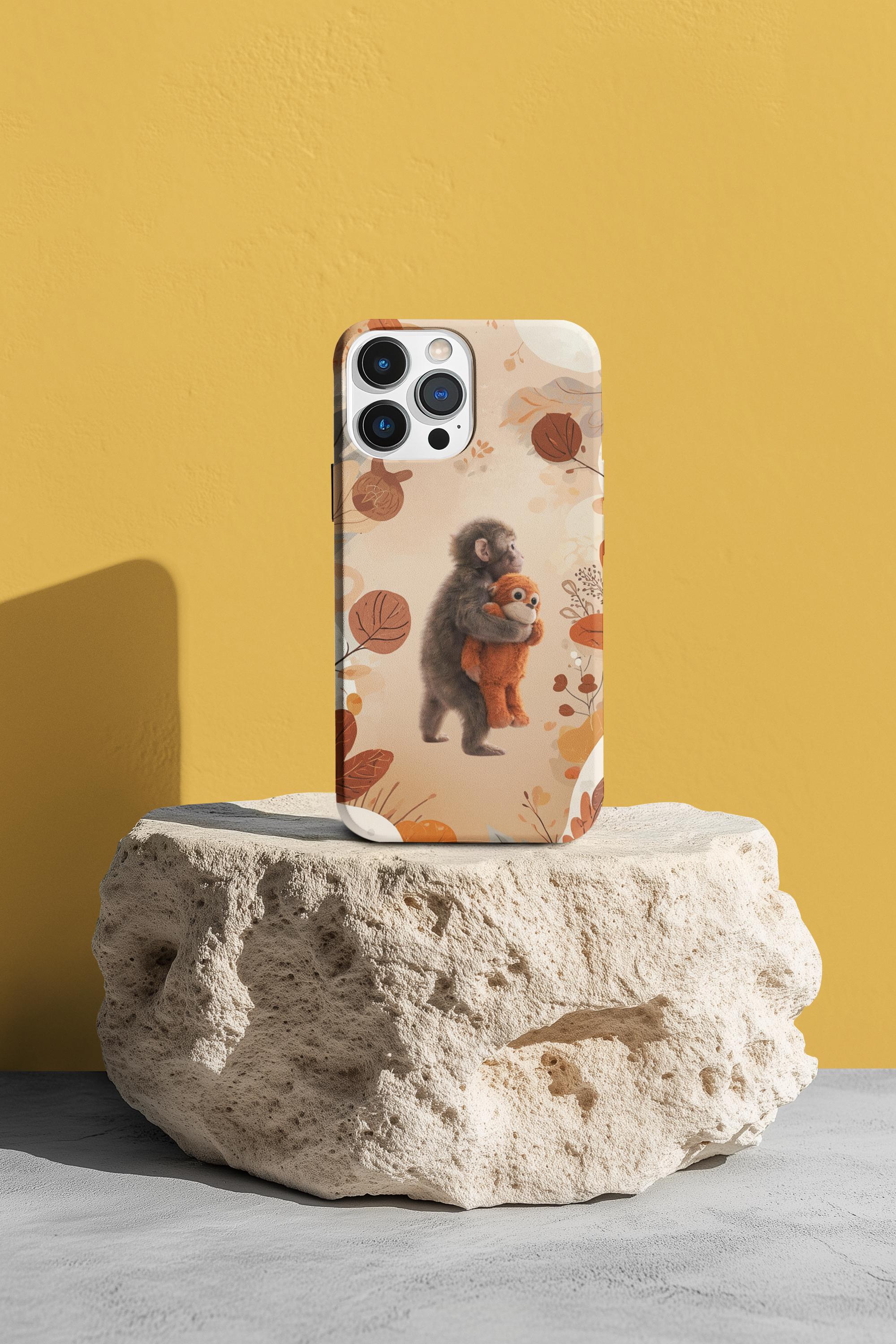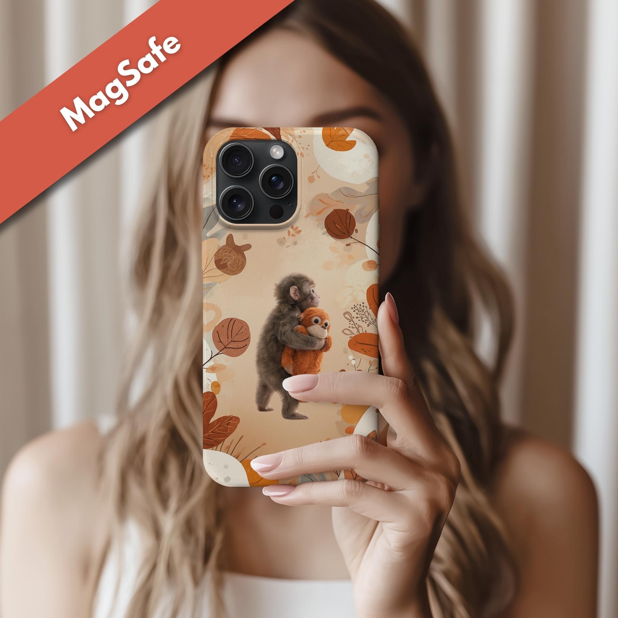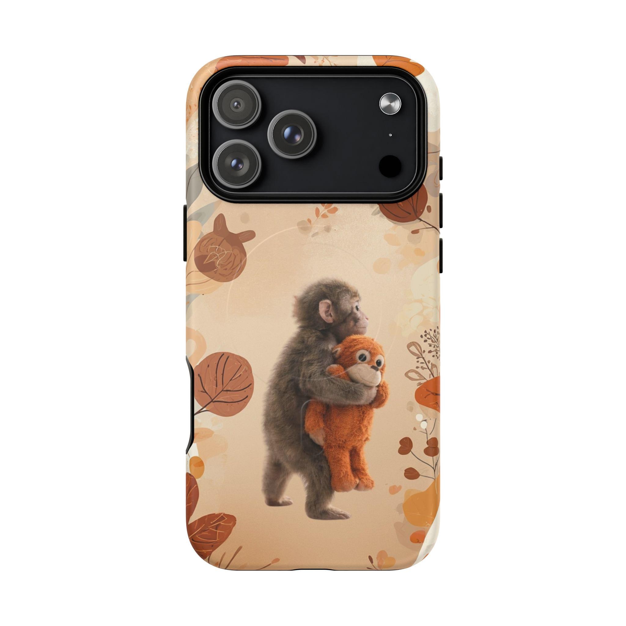 A protective phone case that feels like a small, heartfelt story in your hand. The soft, earthy illustration of a baby monkey clutching a plush fox wraps around the shell in warm beige and amber tones, creating a gentle, comforting look. The dual-layer build — a tough polycarbonate outer shell with a TPU silicone liner — absorbs shocks while the full-wrap 3D print keeps the artwork vivid and seamless. MagSafe-compatible magnets sit flush inside the case so it pairs cleanly with wireless chargers and accessories. Clear port openings and a choice of glossy or matte finish let the design stay functional and personal every day.