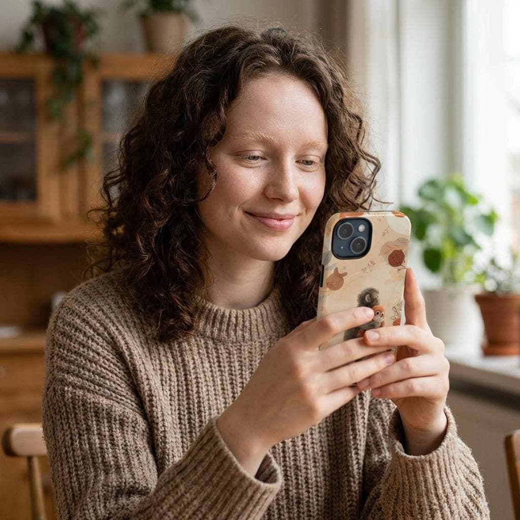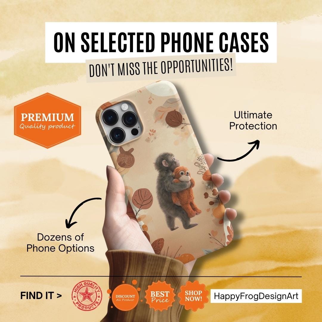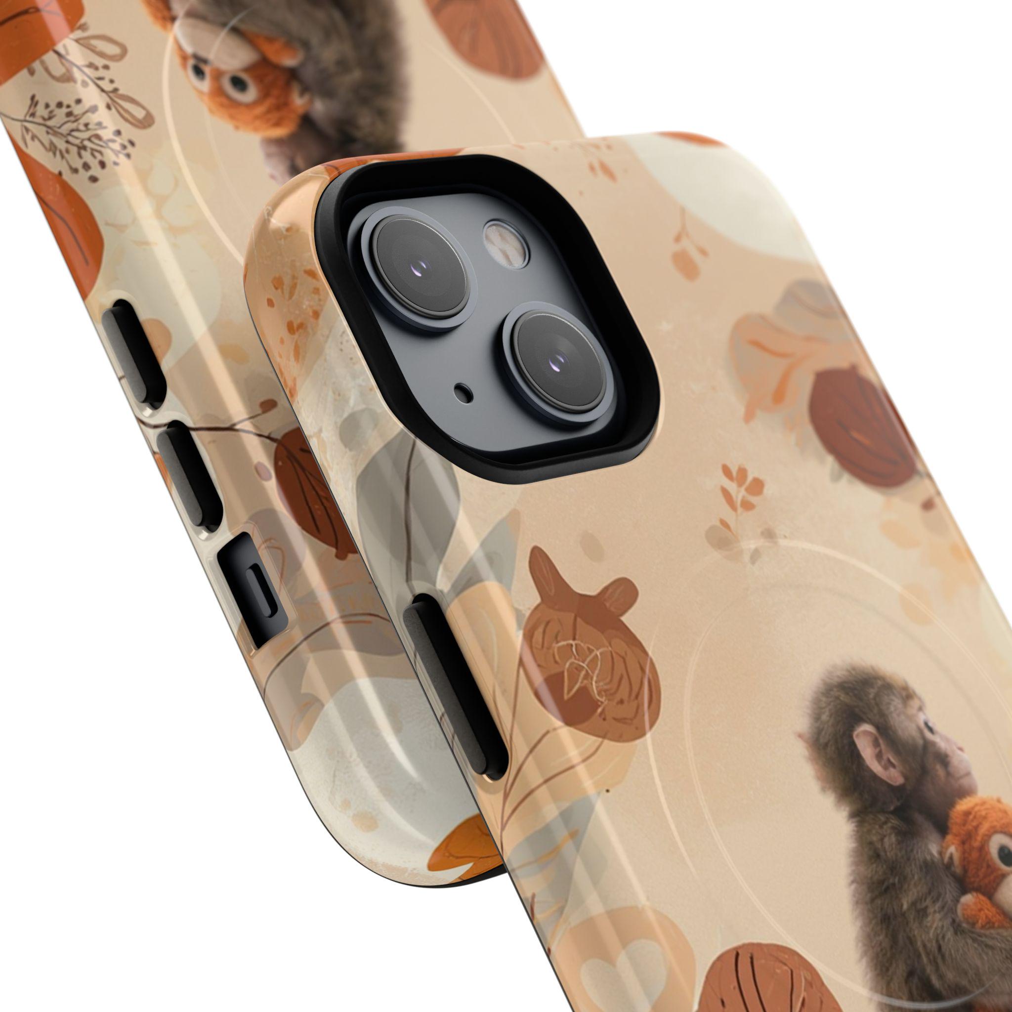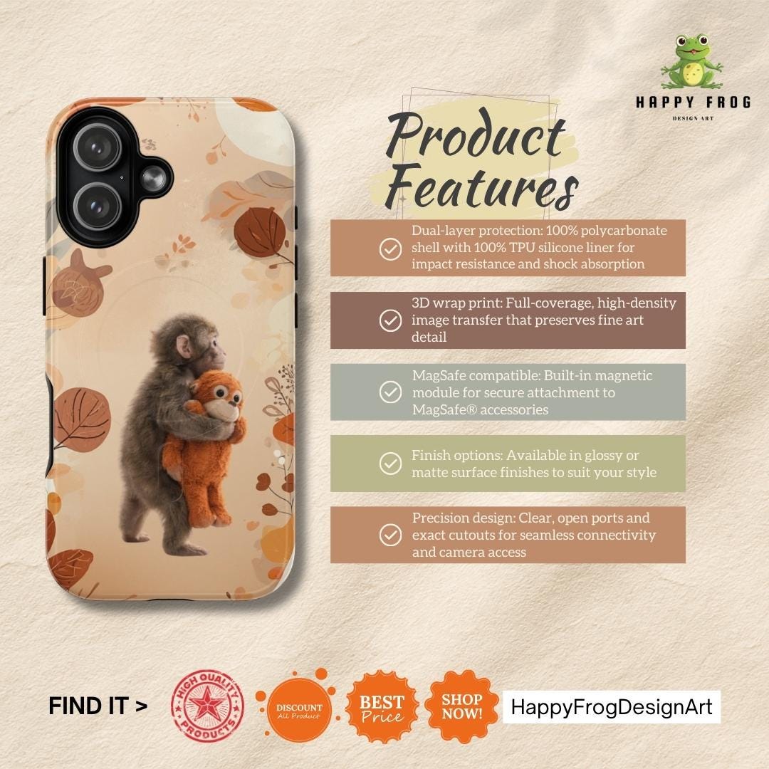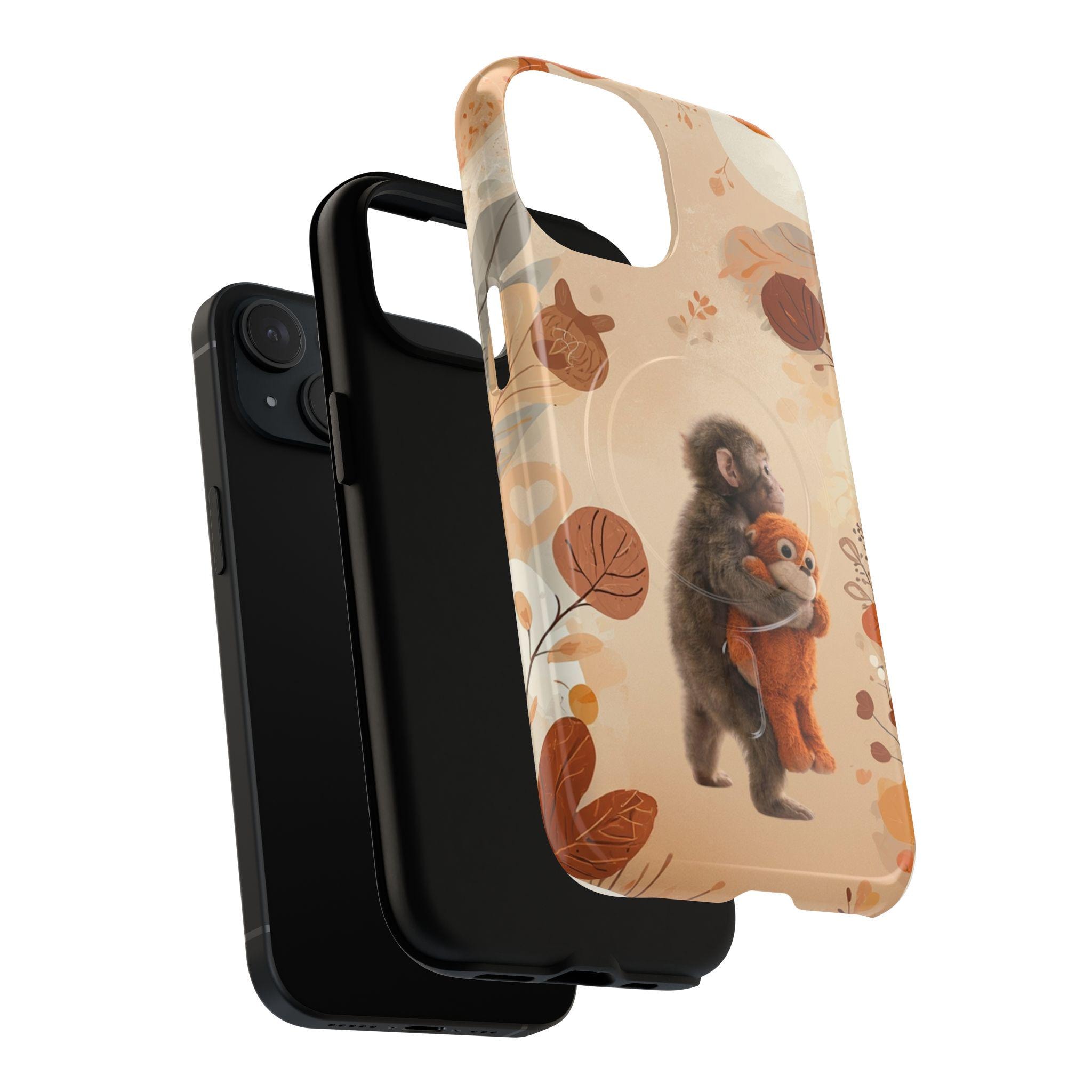 A protective phone case that feels like a small, heartfelt story in your hand. The soft, earthy illustration of a baby monkey clutching a plush fox wraps around the shell in warm beige and amber tones, creating a gentle, comforting look. The dual-layer build — a tough polycarbonate outer shell with a TPU silicone liner — absorbs shocks while the full-wrap 3D print keeps the artwork vivid and seamless. MagSafe-compatible magnets sit flush inside the case so it pairs cleanly with wireless chargers and accessories. Clear port openings and a choice of glossy or matte finish let the design stay functional and personal every day.
