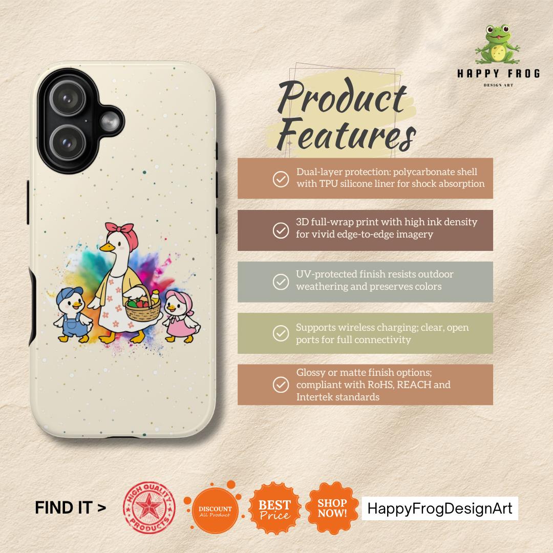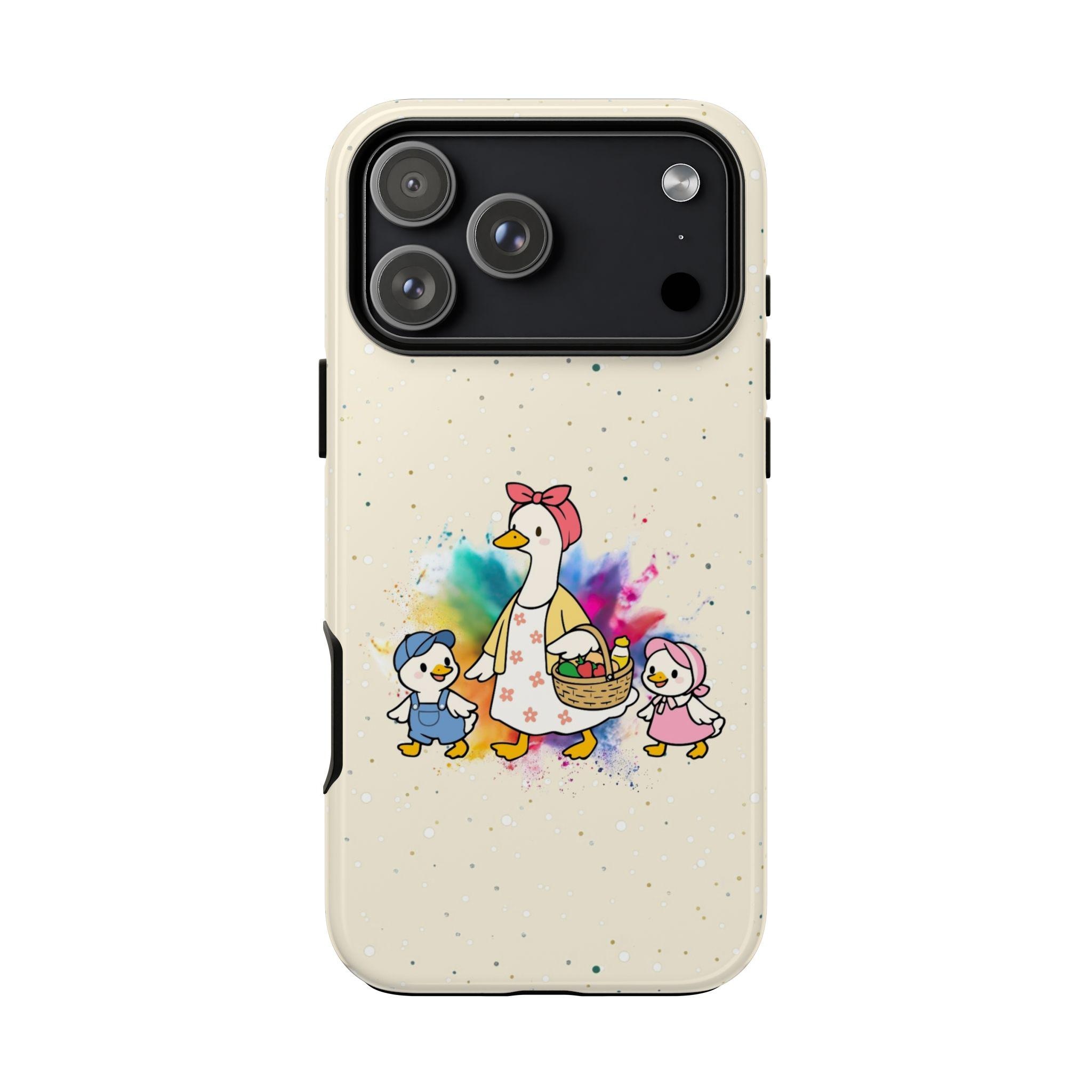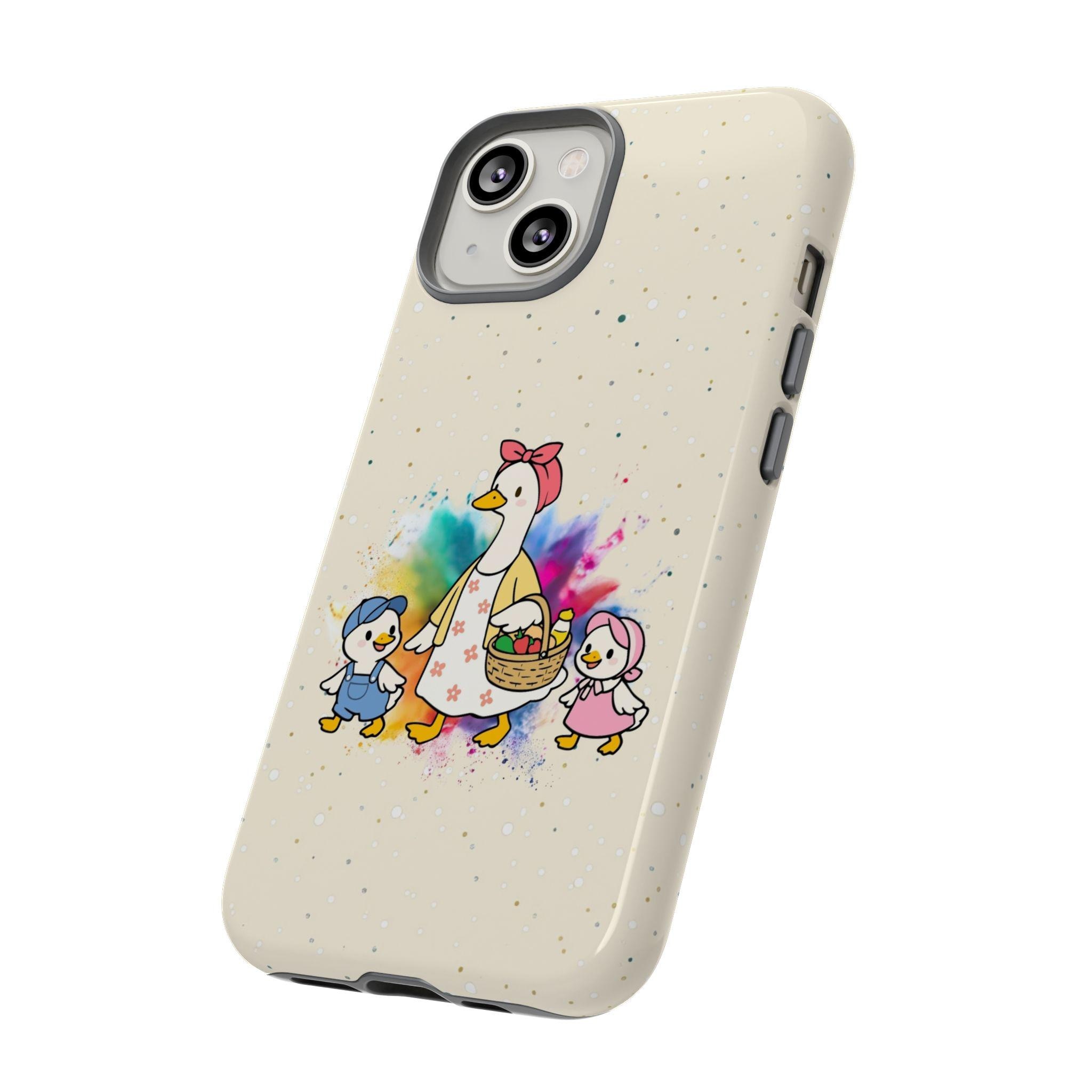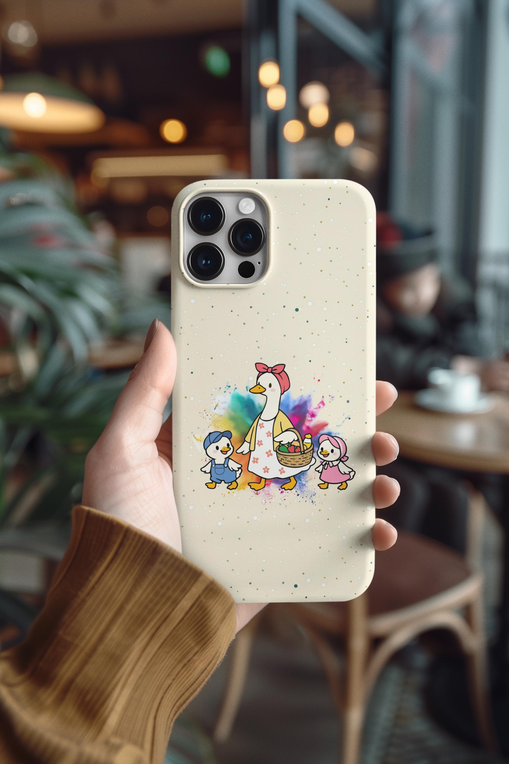 A tough, double-layer phone case that carries a warm, storybook charm. The case features a whimsical mother-goose illustration with two goslings, set against a soft, speckled background and a gentle watercolor splash. It feels like a small, protective talisman — sturdy enough for everyday drops yet light and friendly in appearance. The silicone-lined interior cushions impacts while the hard polycarbonate shell shields against scratches. UV protection keeps the colors from fading outdoors, and the design is printed edge-to-edge for a seamless look. It slips into life with ease: fits wireless charging, leaves ports open, and comes in either glossy or matte finishes to match your style.