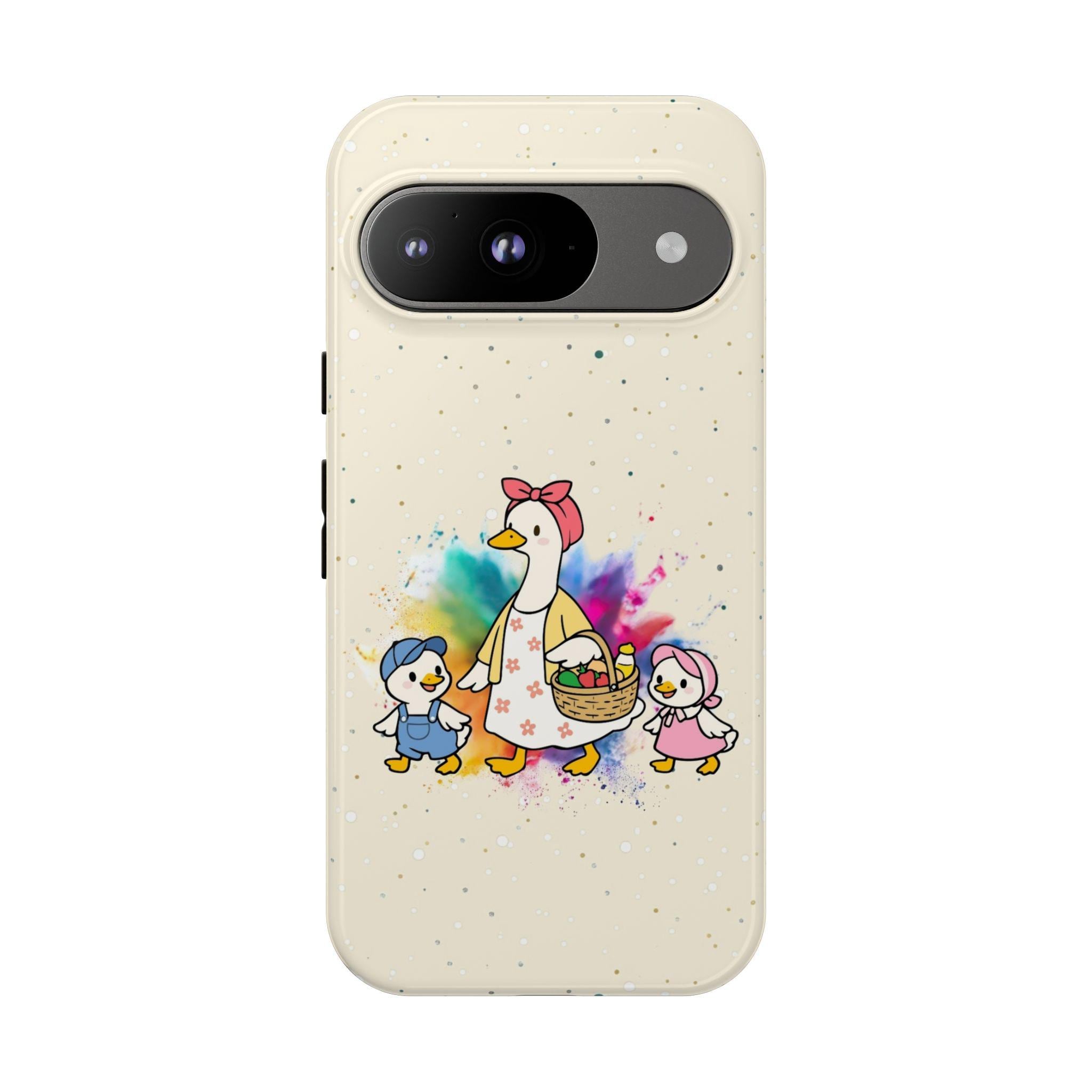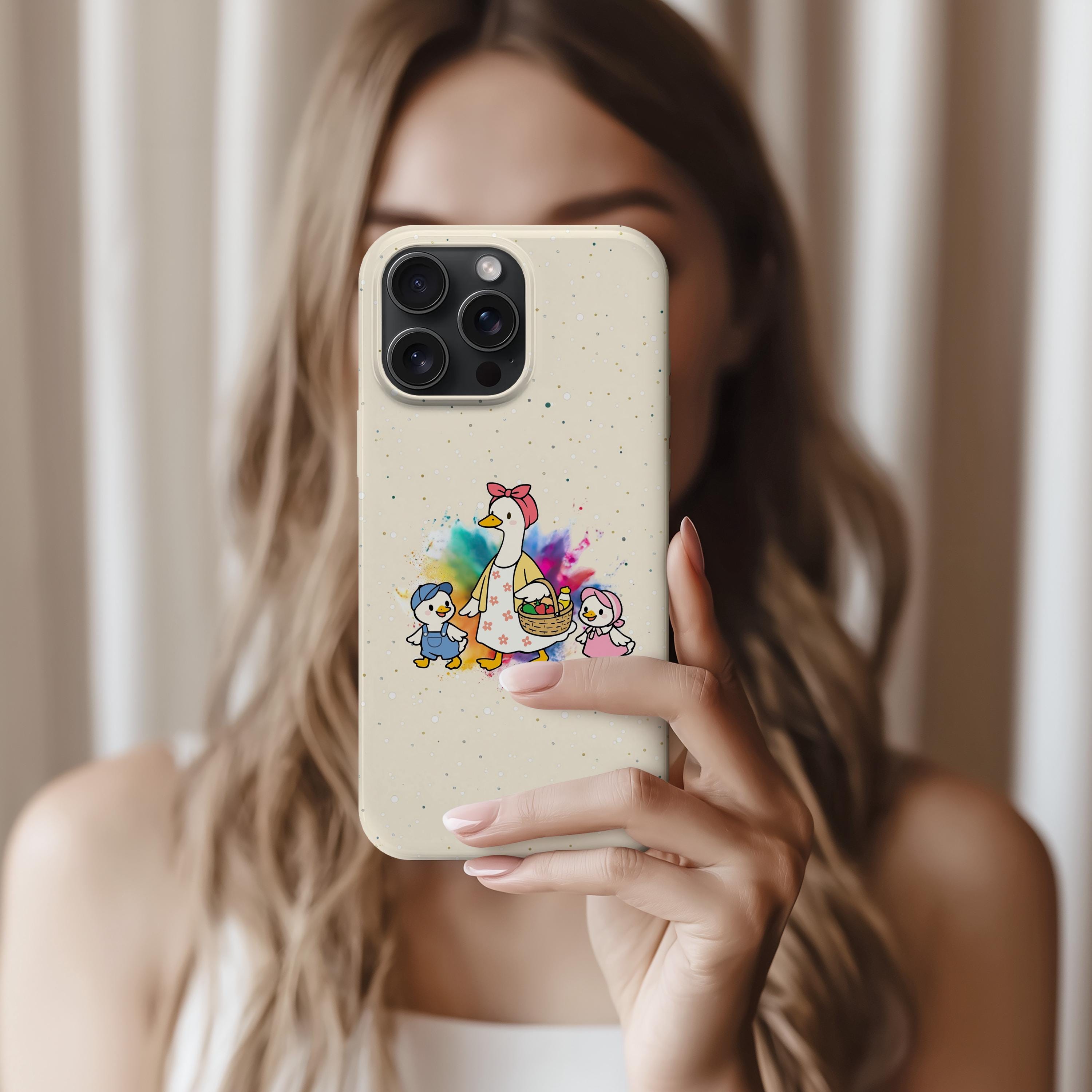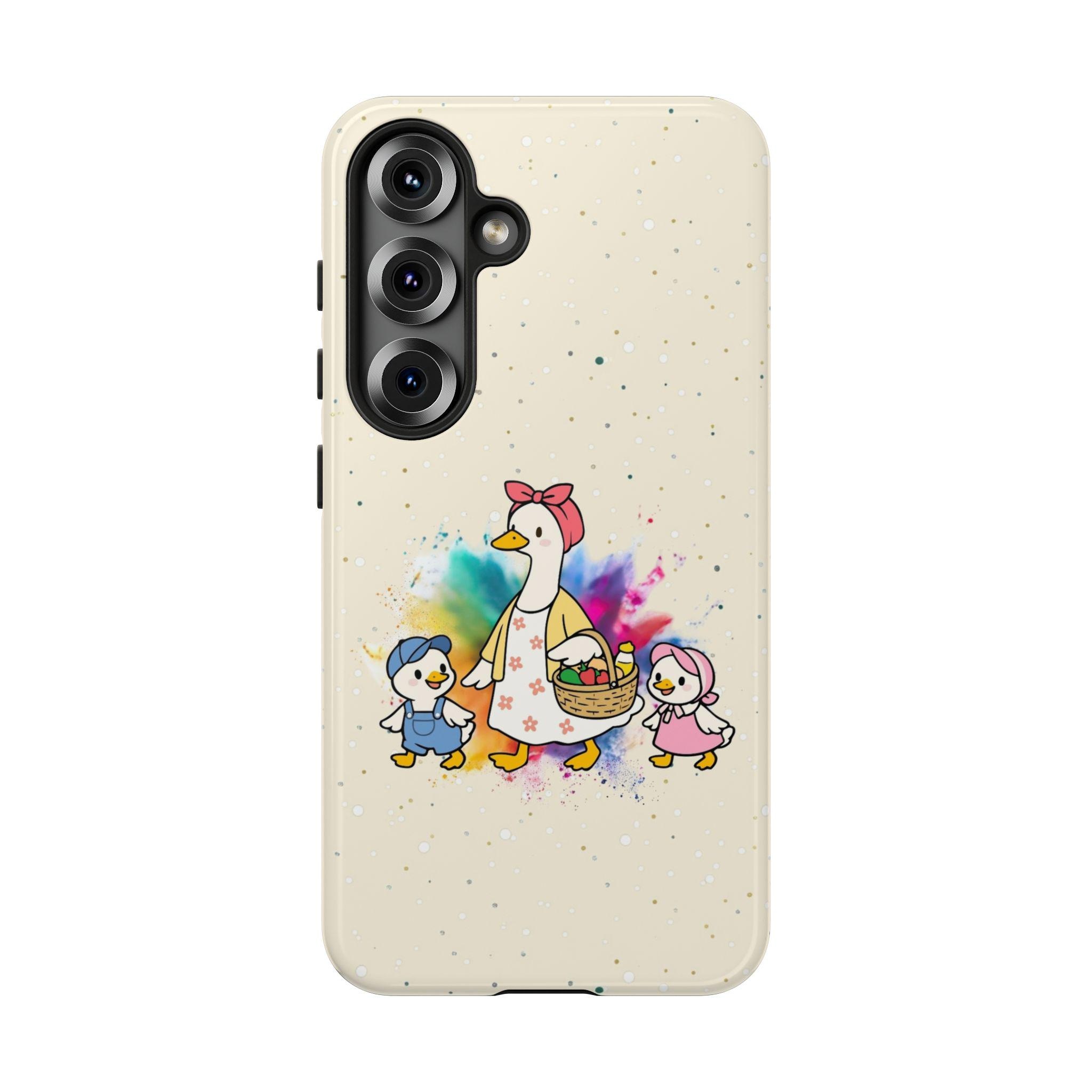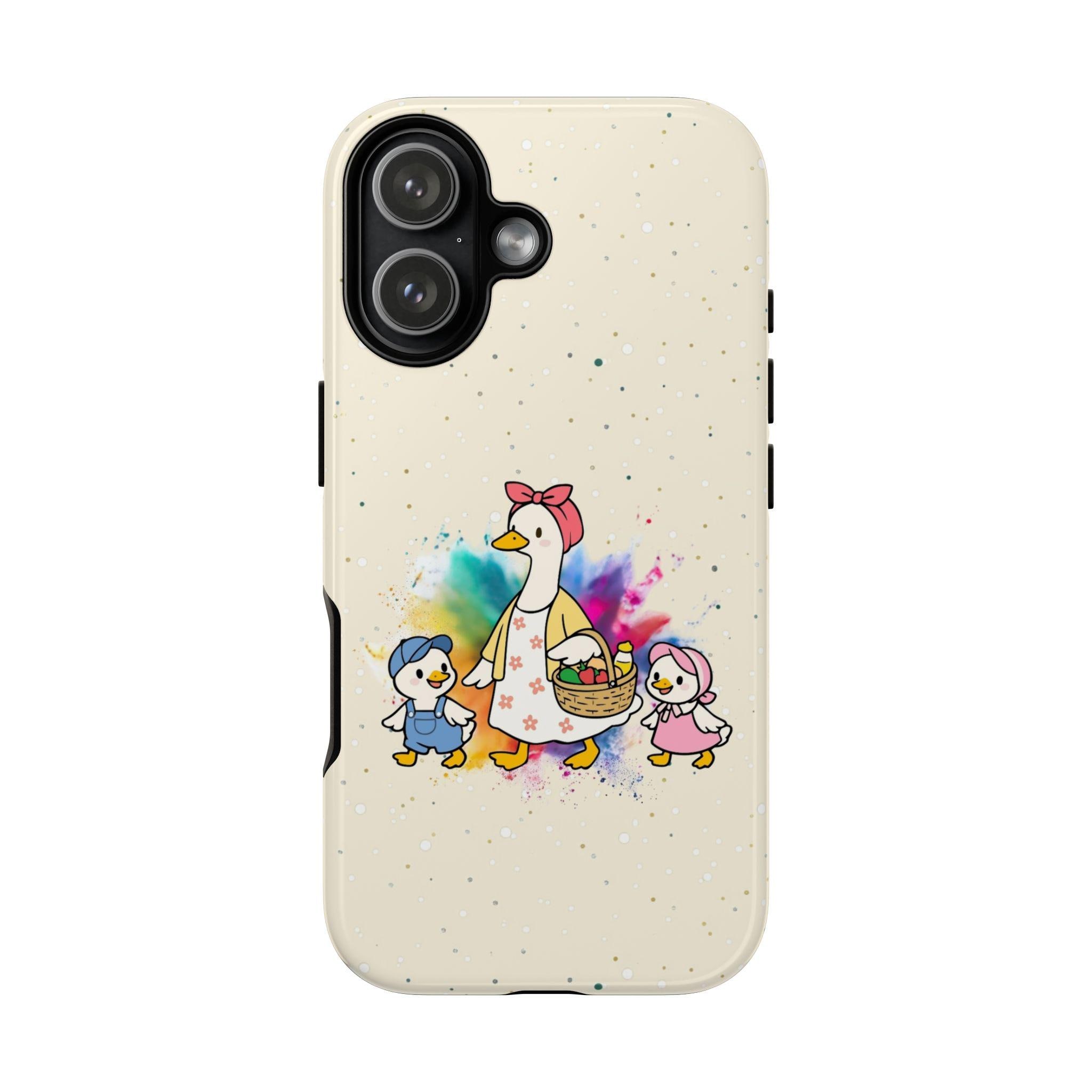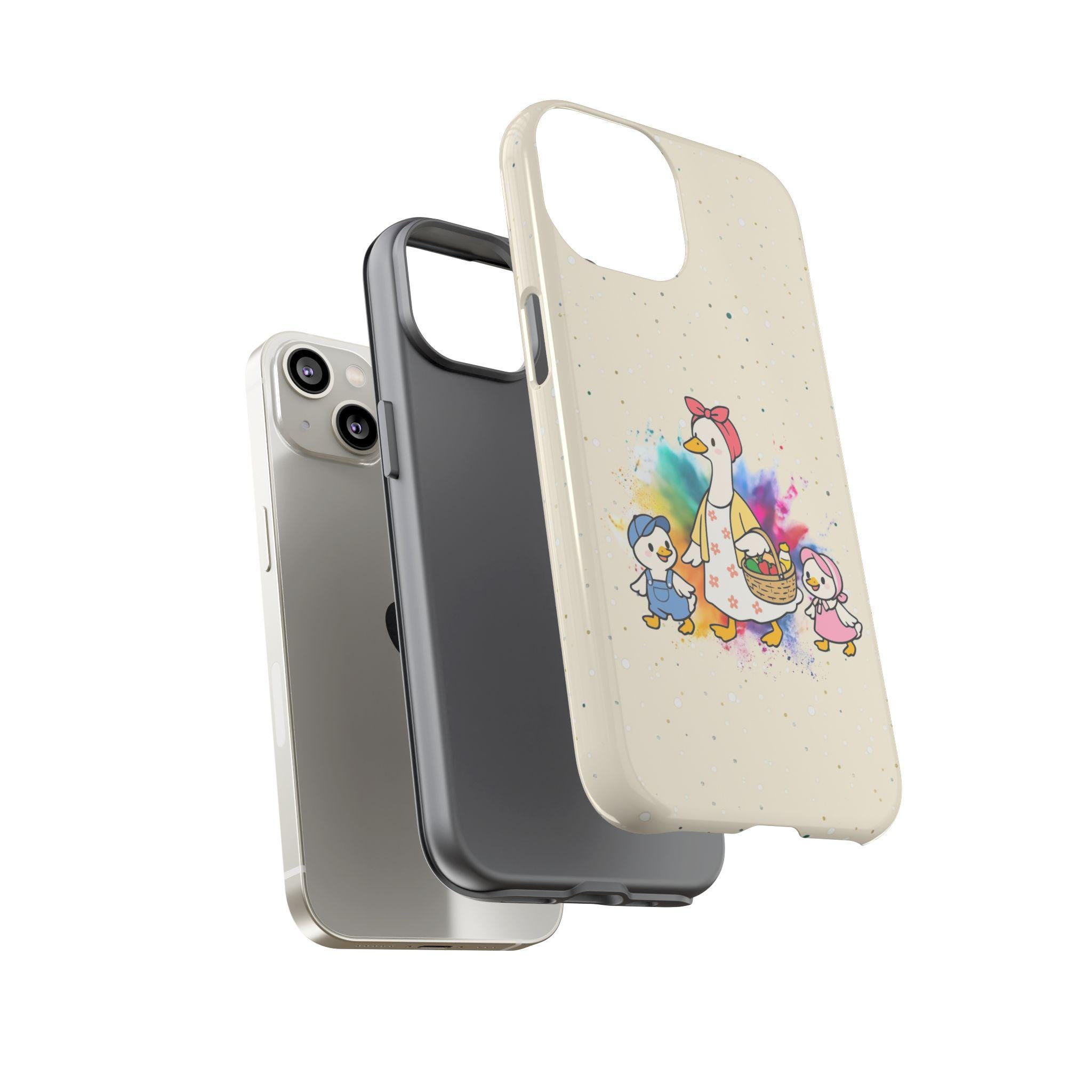 A tough, double-layer phone case that carries a warm, storybook charm. The case features a whimsical mother-goose illustration with two goslings, set against a soft, speckled background and a gentle watercolor splash. It feels like a small, protective talisman — sturdy enough for everyday drops yet light and friendly in appearance. The silicone-lined interior cushions impacts while the hard polycarbonate shell shields against scratches. UV protection keeps the colors from fading outdoors, and the design is printed edge-to-edge for a seamless look. It slips into life with ease: fits wireless charging, leaves ports open, and comes in either glossy or matte finishes to match your style.