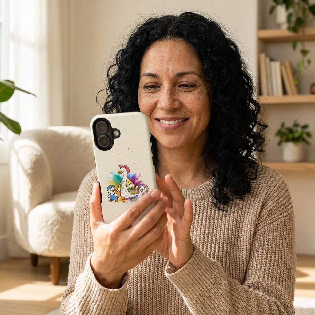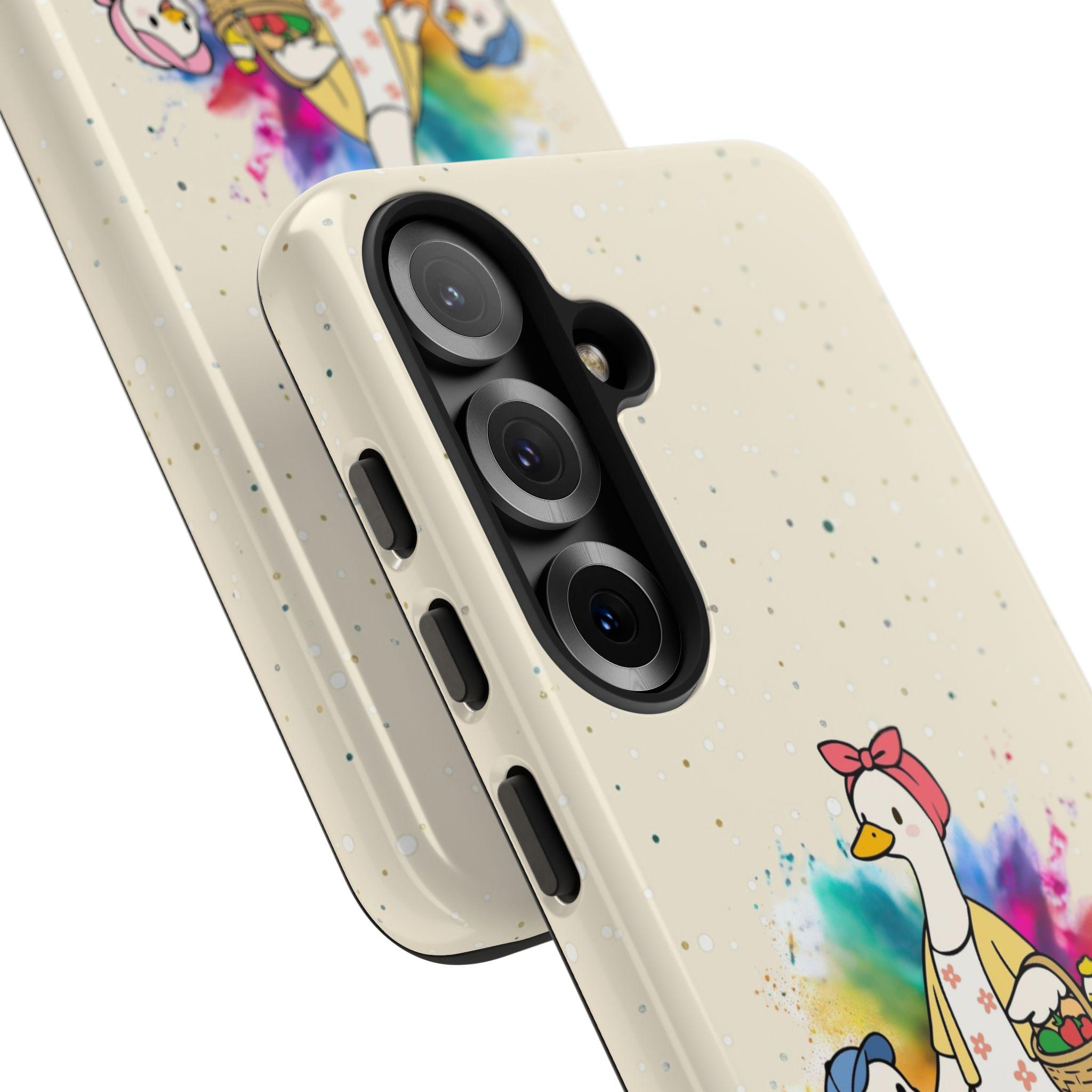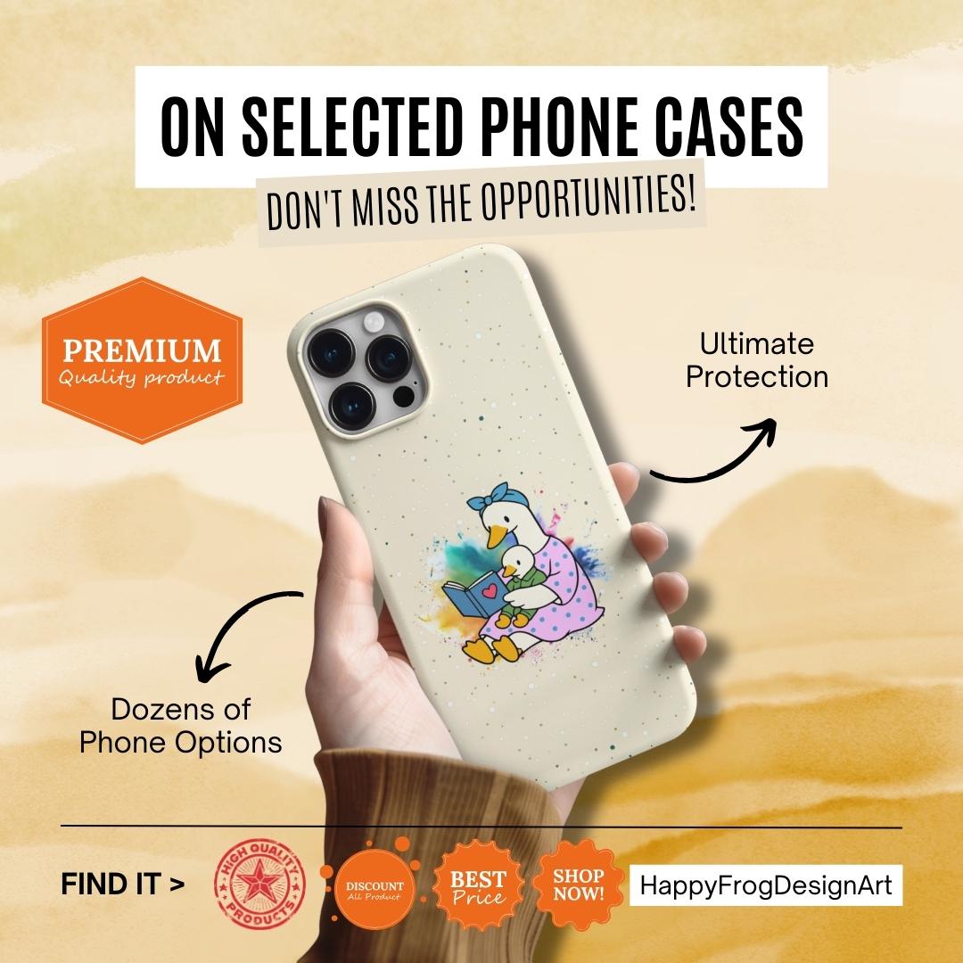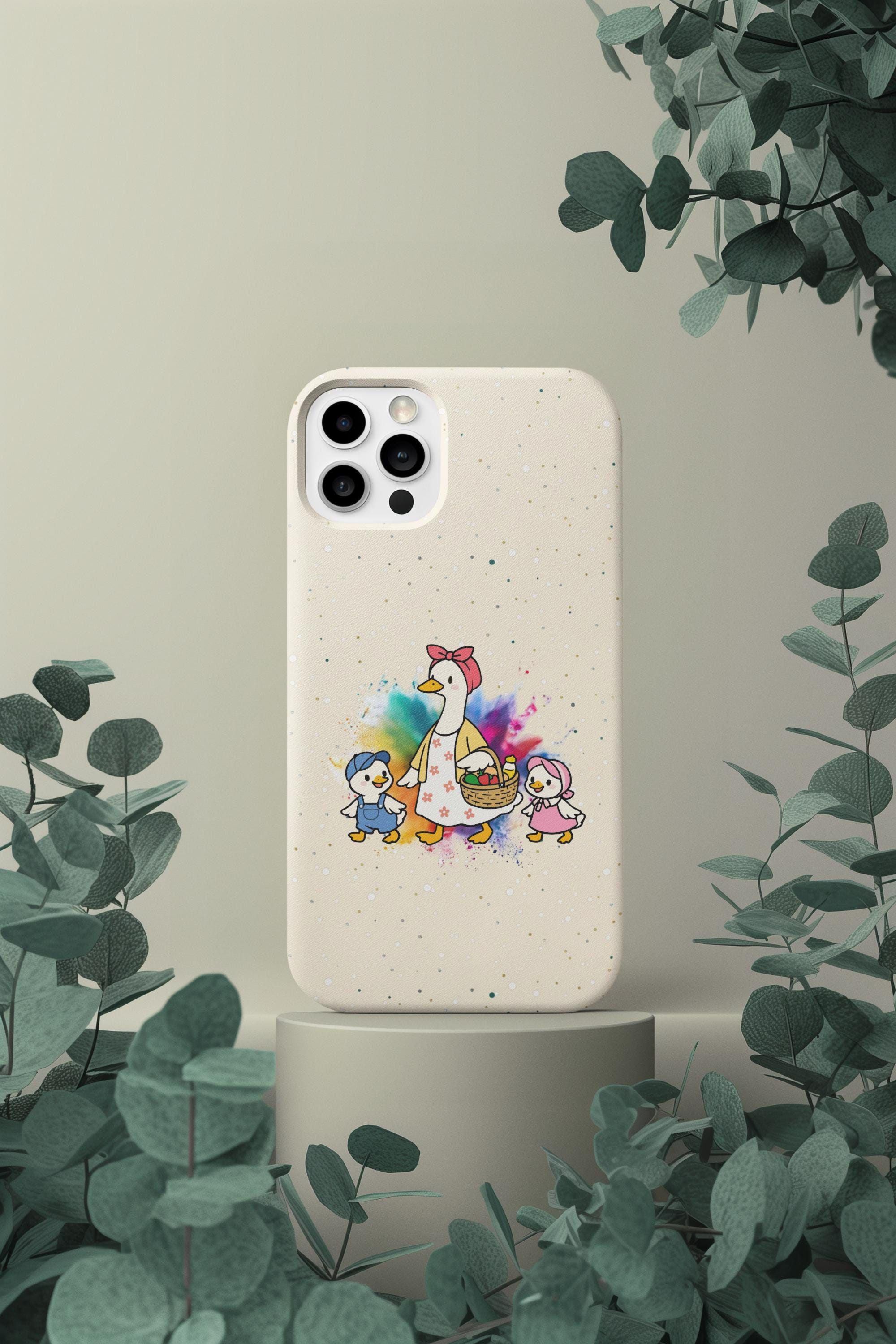 A tough, double-layer phone case that carries a warm, storybook charm. The case features a whimsical mother-goose illustration with two goslings, set against a soft, speckled background and a gentle watercolor splash. It feels like a small, protective talisman — sturdy enough for everyday drops yet light and friendly in appearance. The silicone-lined interior cushions impacts while the hard polycarbonate shell shields against scratches. UV protection keeps the colors from fading outdoors, and the design is printed edge-to-edge for a seamless look. It slips into life with ease: fits wireless charging, leaves ports open, and comes in either glossy or matte finishes to match your style.