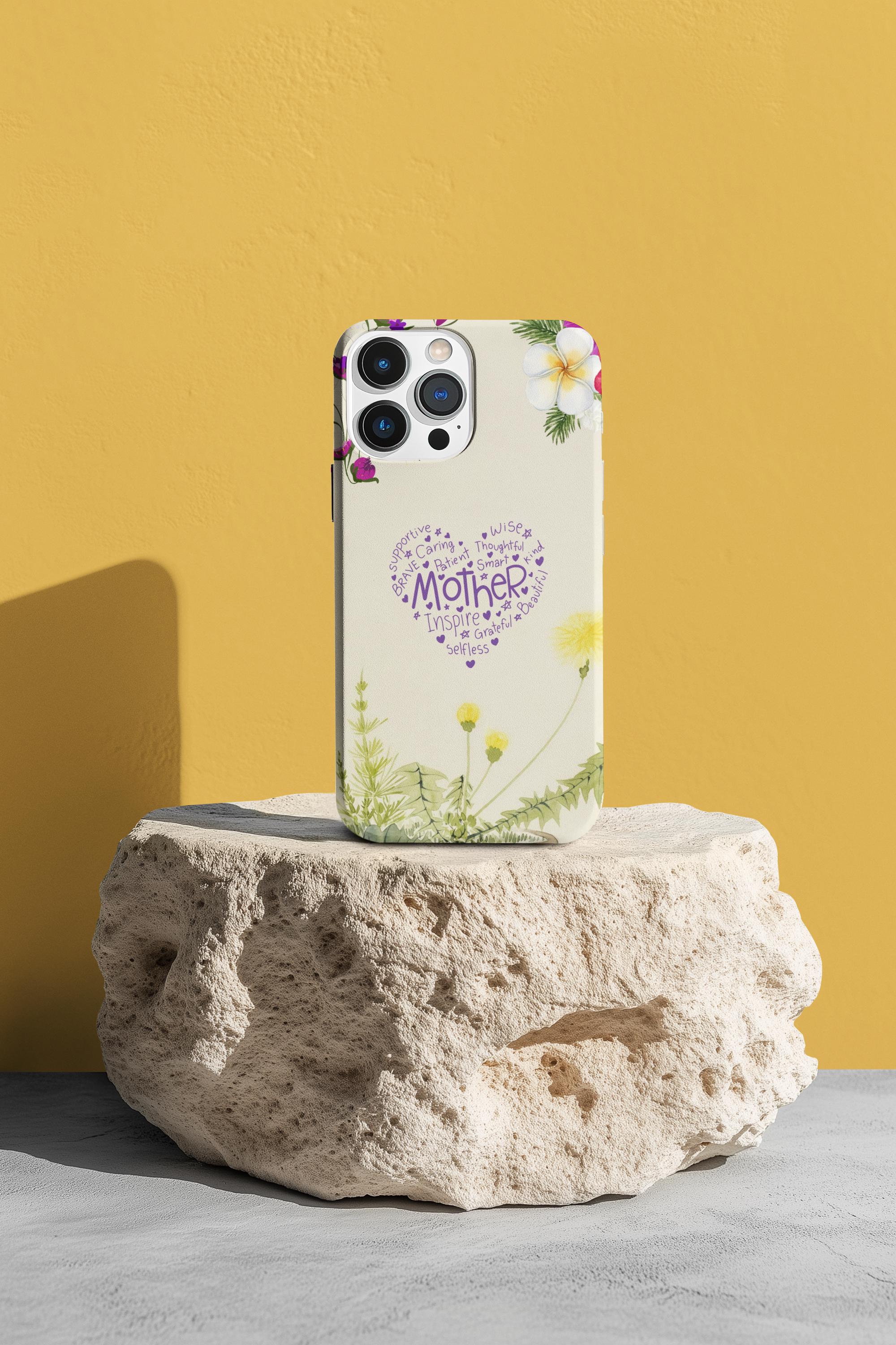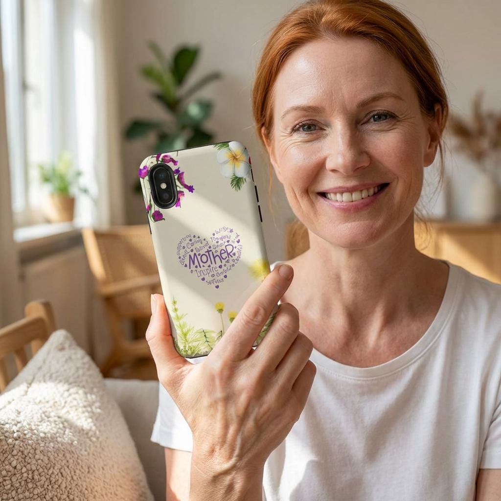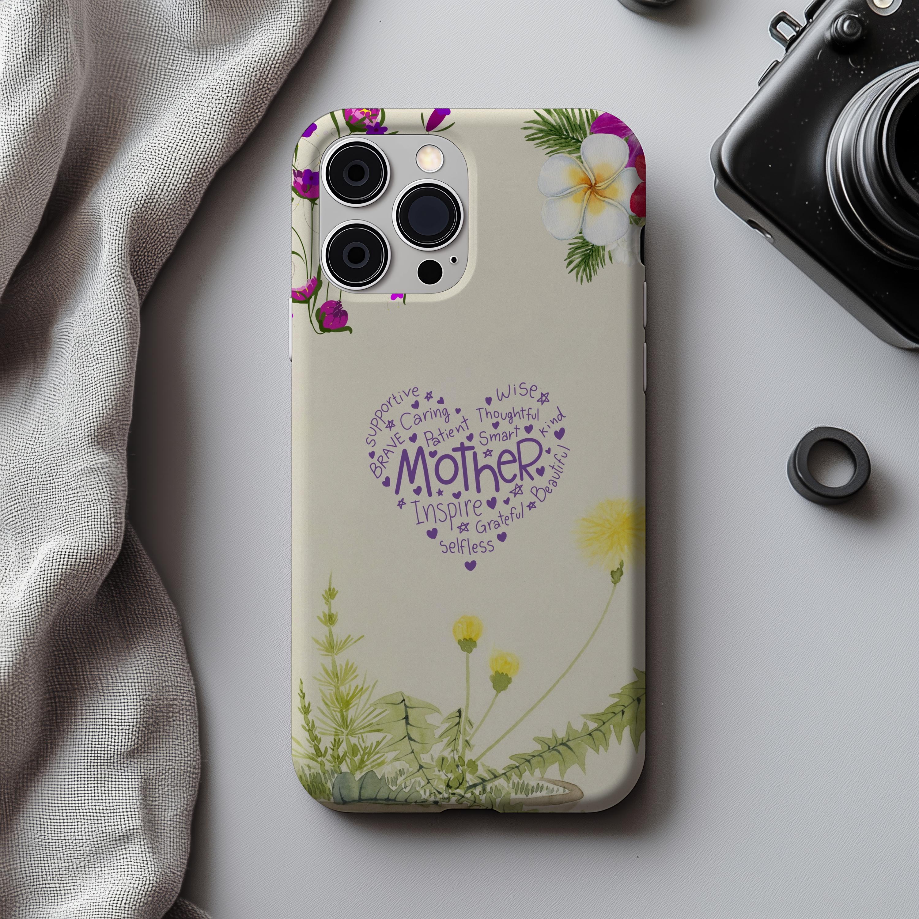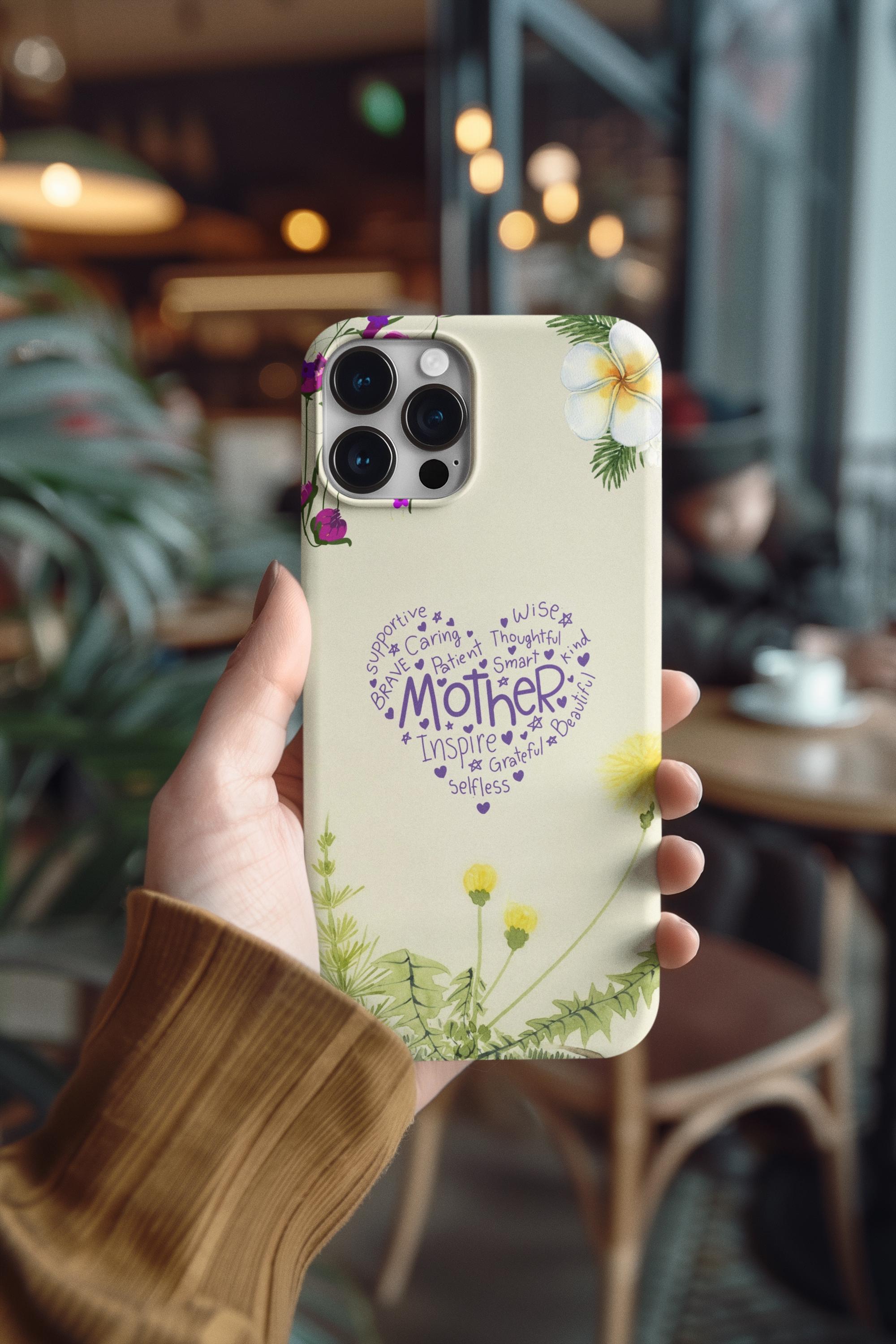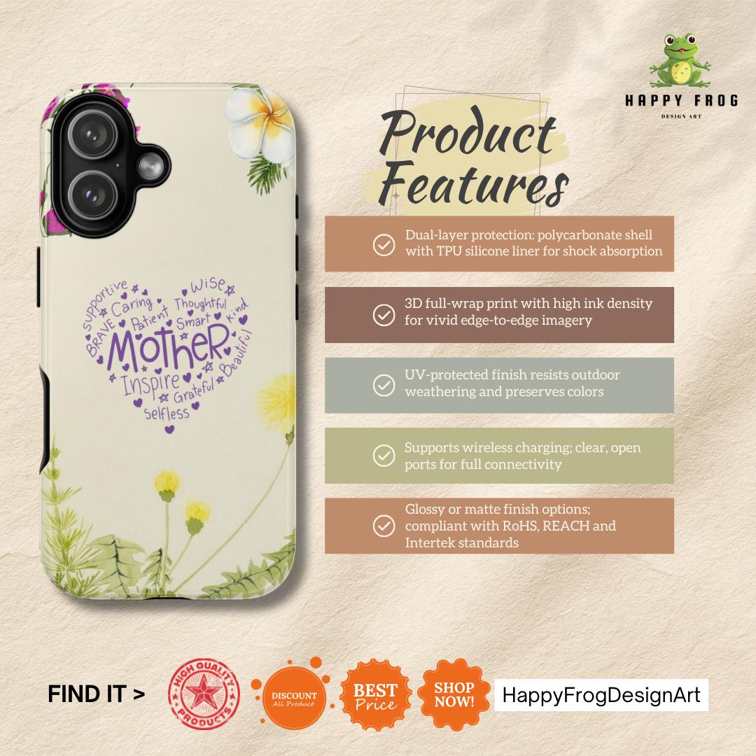 A slim, dual-layer protective phone case that blends soft botanical watercolor art with a heartfelt typographic heart reading “Mother.” The glossy or matte shell features a full-wrap 3D print that keeps colors vivid and resists outdoor fading, while the TPU silicone liner cushions shocks and helps absorb drops. Clear port openings preserve connectivity and wireless charging compatibility, and the finished look is certified for safe materials. This case wears like a small keepsake—gentle floral edges and a warm cream background make it feel like a pocket-sized note of gratitude every time the phone is picked up.