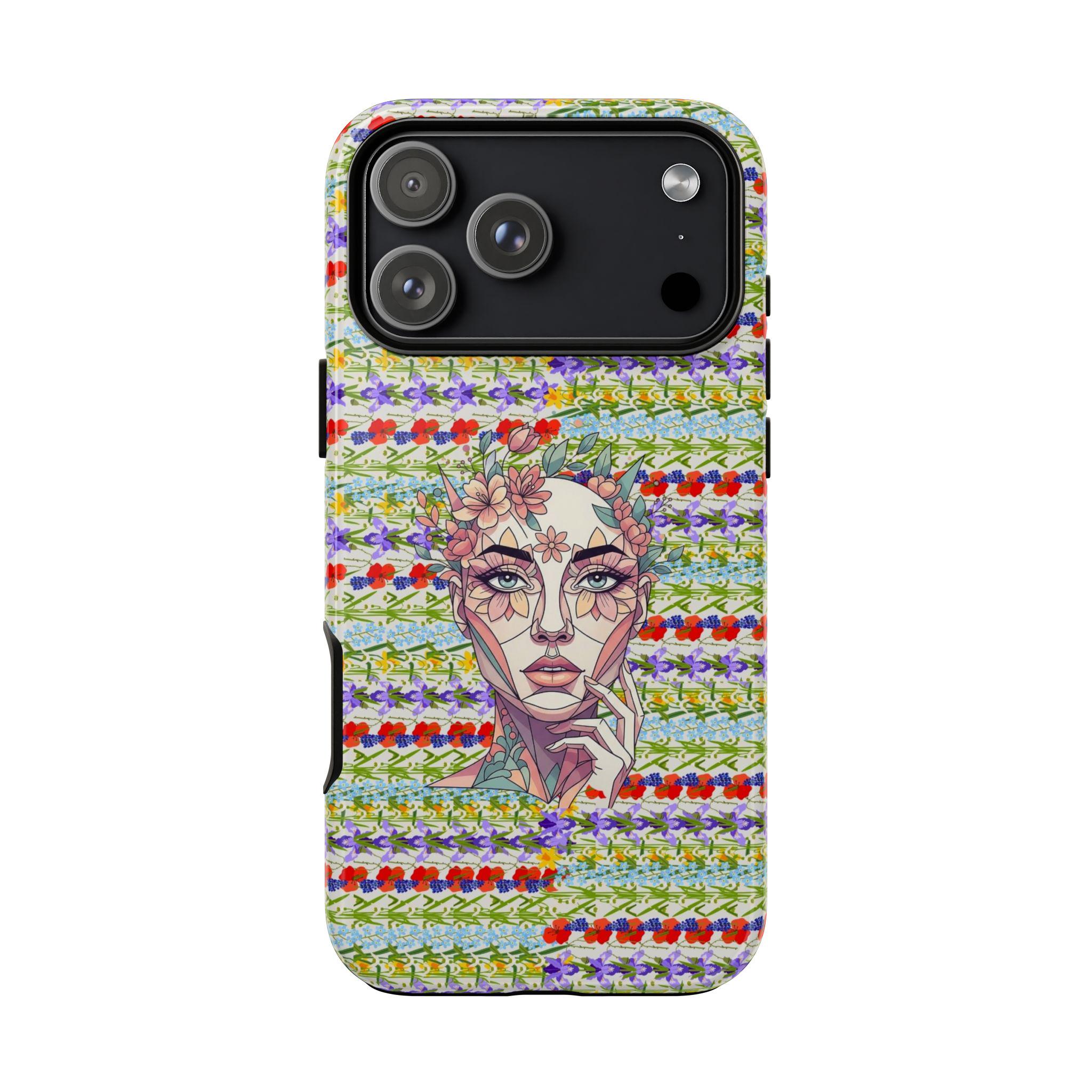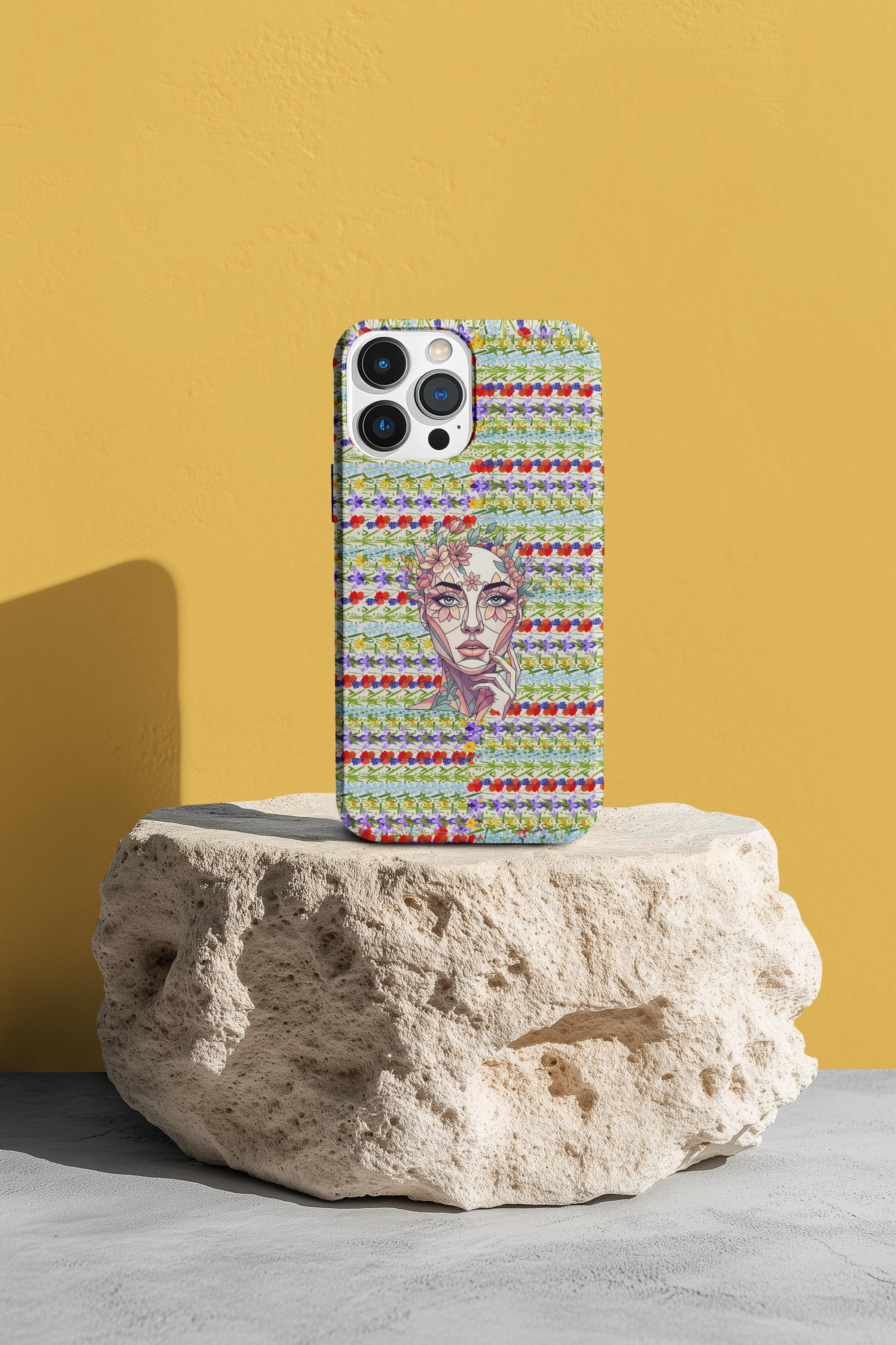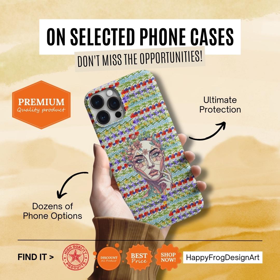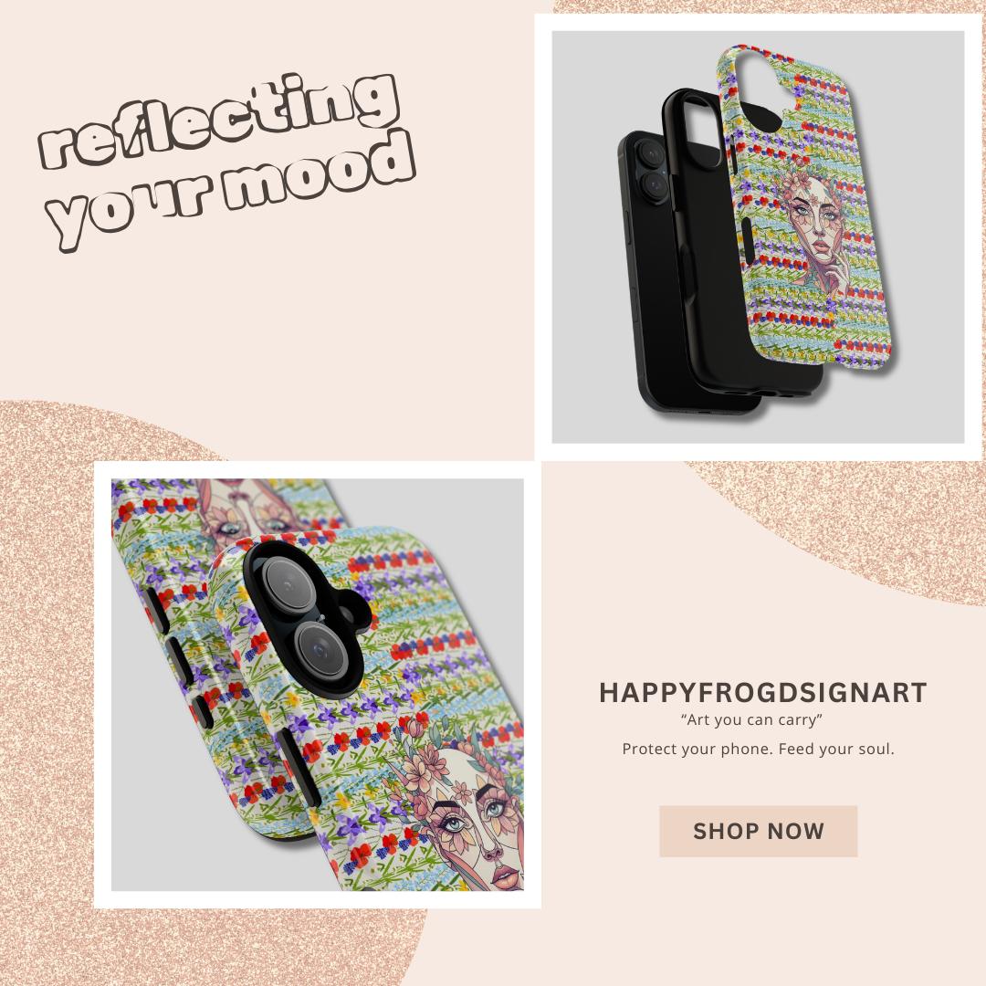 Elevate your device with our most sophisticated design yet. The HappyFrogDesignArt "Floral Bloom" case features a stunning, surrealist portrait of a serene female silhouette, intertwined with intricate botanical patterns. It’s a masterpiece that blends futuristic geometry with the timeless beauty of a wild garden.