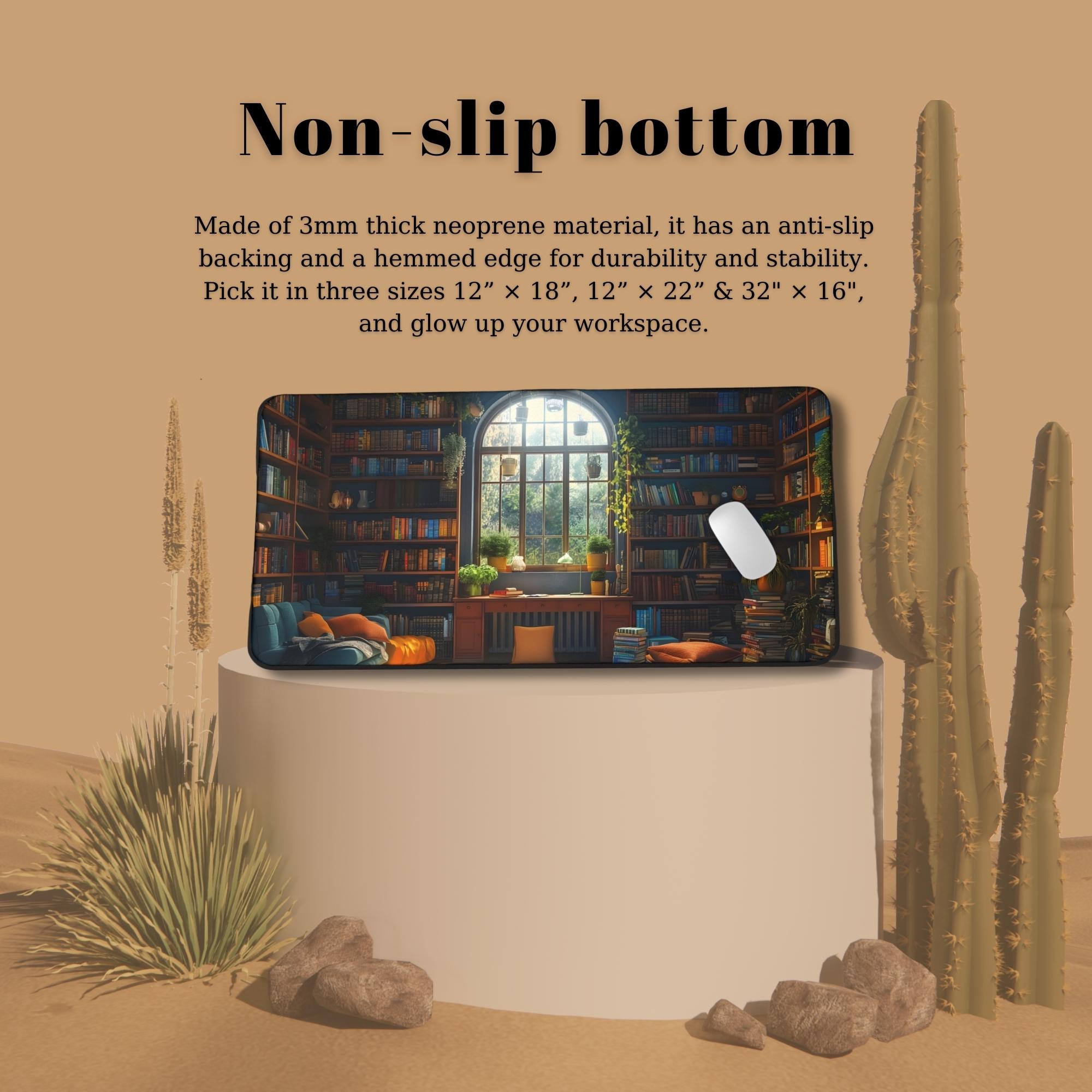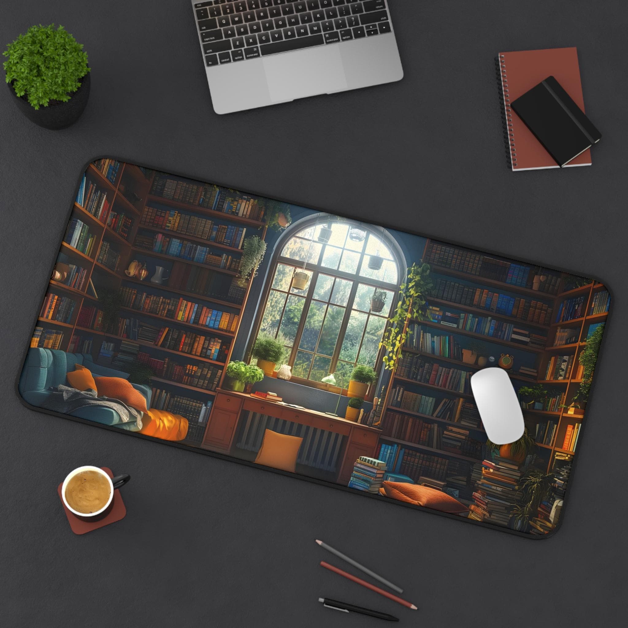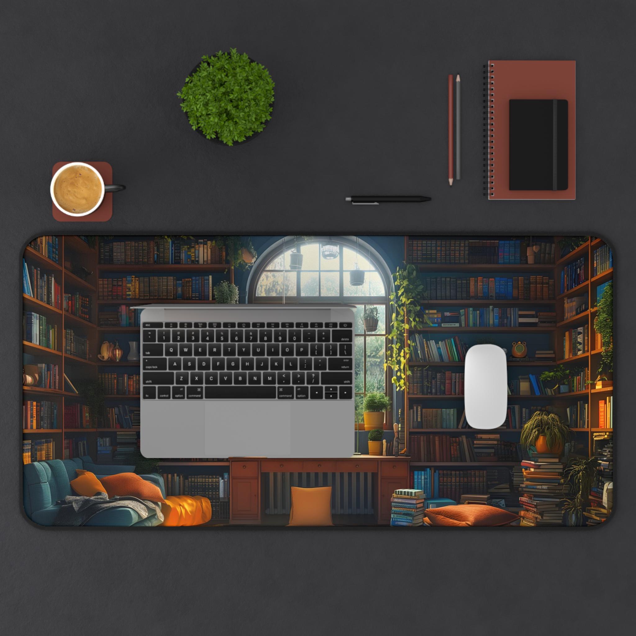 A roomy neoprene desk mat printed with a cozy library scene that brings warmth and calm to your workspace. The soft, vibrant print shows sun spilling through a tall arched window into a nest of cushions, bookshelves, and plants — a small reading nook captured in rich, crisp color. The textured, anti-slip backing holds the mat steady during typing or crafting, while stitched hemmed edges keep the design intact through daily use. Available in three sizes to suit compact desks or larger workstations, this mat doubles as a mouse surface, writing pad, and protective layer for treasured desks. It invites slower moments, focused work, and the comfort of a well-loved book corner right where you create.